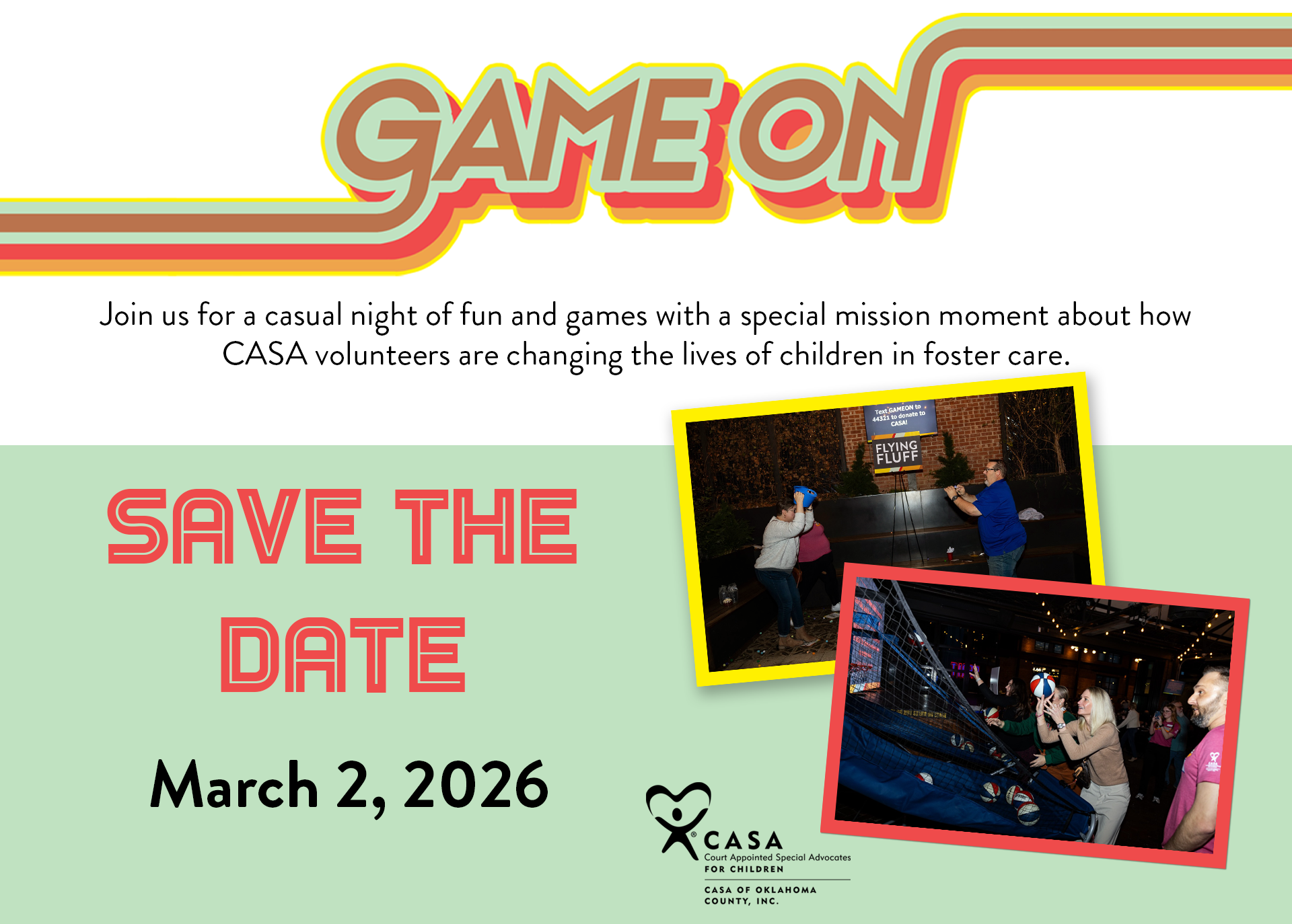 Our Game On with CASA fundraiser will be on March 2nd, 2026. This interactive fundraising celebration features a casual evening highlighting the power of change a volunteer can make through compassionate advocacy.